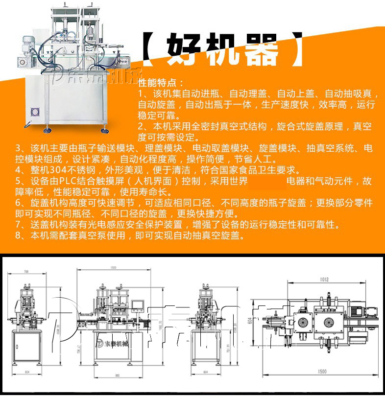 1.該機集自動進瓶、自動理瓶、自動上蓋、自動抽真空、自動旋蓋、自動出瓶于一體,生產(chǎn)速度快,效率高,運行穩(wěn)定可靠。