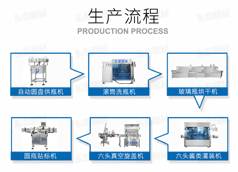 自動(dòng)供瓶機(jī)+全自動(dòng)滾筒洗瓶機(jī)+自動(dòng)六米烘干機(jī)+自動(dòng)收瓶機(jī)+全自動(dòng)六頭灌裝機(jī)自動(dòng)灌裝+全自動(dòng)提蓋機(jī)自動(dòng)理蓋、提蓋、掛蓋+六頭真空旋蓋機(jī)同時(shí)六個(gè)頭真空旋蓋+套標(biāo)機(jī)+收縮機(jī)+圓瓶貼標(biāo)機(jī)+整理平臺(tái);
