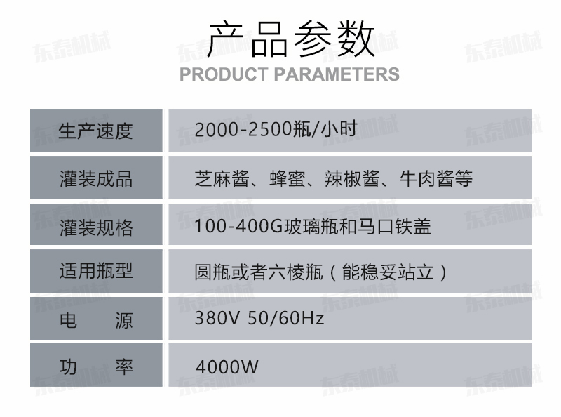 B、灌裝機(jī)采用橫推料的方式,縮短了下料斗到灌裝頭的距離,提高了灌裝速度,更重要的是解決了含油量大的物料在灌裝過(guò)程中出現(xiàn)的有的瓶油多,有些瓶醬多的灌裝難.,大大提高了灌裝精度。