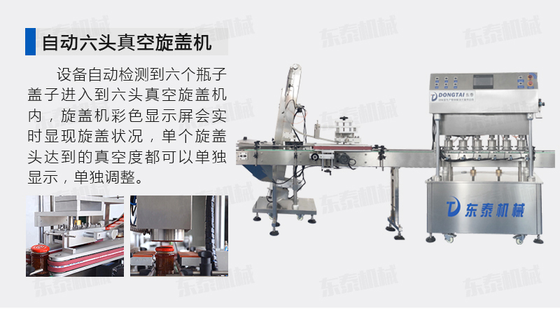 該直線式真空旋蓋機(jī)是東泰機(jī)械結(jié)合用戶使用的情況,摒棄了傳統(tǒng)轉(zhuǎn)盤式真空旋蓋機(jī)的弊端,研制開發(fā)的設(shè)備,設(shè)備自動(dòng)檢測(cè)到六個(gè)瓶子蓋子進(jìn)入到六頭真空旋蓋機(jī)內(nèi),旋蓋機(jī)彩色顯示屏?xí)?shí)時(shí)顯現(xiàn)旋蓋狀況,整機(jī)多點(diǎn)檢測(cè),當(dāng)進(jìn)口無(wú)瓶無(wú)蓋、出口堵塞、定位不準(zhǔn)、瓶身傾倒均自動(dòng)停機(jī)。單個(gè)旋蓋頭達(dá)到的真空度都可以單獨(dú)顯示,單獨(dú)調(diào)整!
